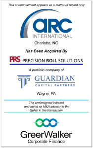 GreerWalker Corporate Finance LLC, the investment banking affiliate of GreerWalker LLP, is pleased to announce that it served as M&A advisor to Charlotte-based ARC International (“ARC”) on its sale to Precision Roll Solutions, LLC (“PRS”), a portfolio company of Guardian Capital Partners. Founded in 1984, ARC has become an expert in providing innovative engraving solutions for the corrugated packaging sector. The transaction closed in December 2024.